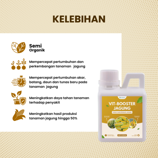 VIT-BOOSTER JAGUNG spesialis tanaman jagung yang dapat membuat anakan tanaman menjadi lebih banyak, membuat tanaman lebih tahan terhadap serangan penyakit, serta dapat meningkatkan produksi panen hingga 3x lipat.